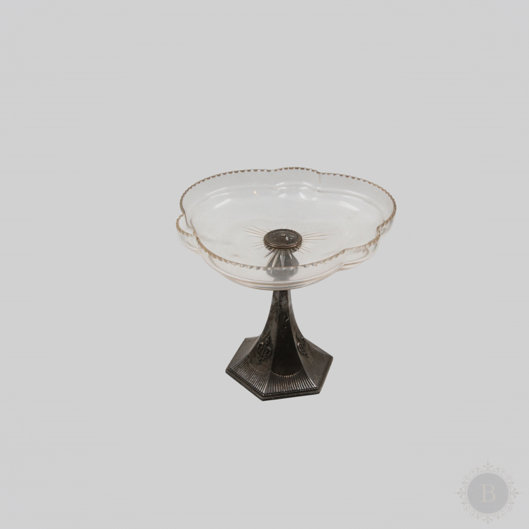 Prelep ausec iz perioda secesije, izrađen od starog, kvalitetnog stakla i posrebrenog mesinga, datira iz perioda nakon 1914. godine, oko 1920. Staklo je oblikovano u formi lista sa elegantno fazetiranim rubovima, što mu daje sofisticiranu notu. Posrebrena stopa je dekorisana karakterističnim venčićem pri dnu, tipičnim za stil secesije. Ovaj autentični antikvitet kombinuje funkcionalnost i dekorativnost, idealan je za kolekcionare, enterijere u retro stilu ili kao unikatan poklon sa istorijskim šarmom.