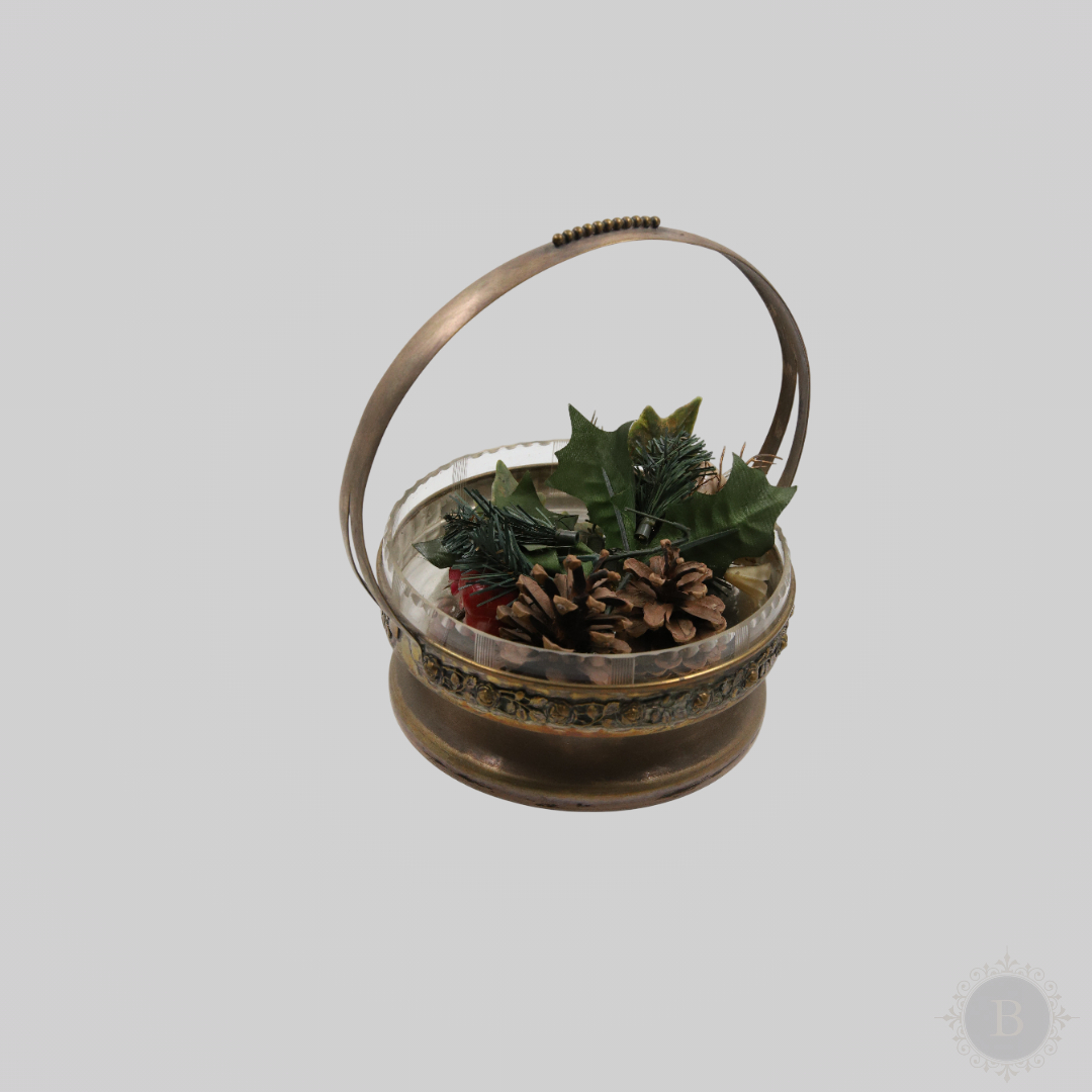Na ovom predmetu posebno se ističe niz reljefnih ružica duž ivice – klasičan secesijski simbol, dok je ručica obrađena u istom stilu, sa finim zakrivljenjima i bogatom obradom metala. Stakleni deo je ukrašen malim fazetama i nežno brušenim rubovima, što doprinosi rafiniranoj vizuelnoj celini. Korpica je ne samo estetski dragocena, već i funkcionalna, pogodna za korišćenje ili dekoraciju u klasičnim i modernim enterijerima.