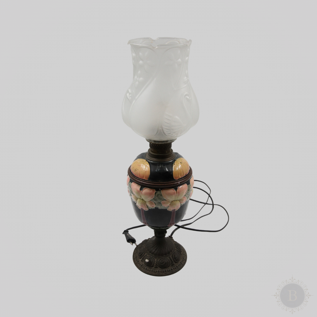 Lampa iz 1930. godine, od majolike u teget boji sa ljiljanima u belim i roze tonovima. Visina 56 cm, elegantna i umetnička dekoracija za vaš prostor.