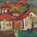 Pejzaž sa kućicama, ulje na šperu Stojana Đurića iz 1999. godine. Veseli kolorit dominira nad crtežom.
